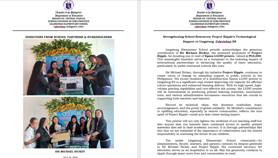 To quote mam Che Lani, “In addition to the paper supplies, Project Ripple also donated T-shirts for school staff—an act that fostered a sense of unity, pride, and belonging within the school community. These shirts are not only functional, but also symbolic of the strong partnership between Project Ripple and Lingatong ES.”